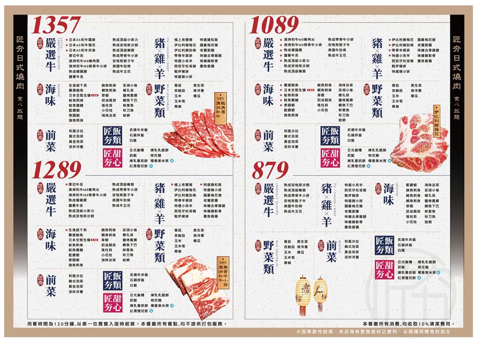 匠夯日式燒肉吃到飽共有四種價位可選擇,分別是$689、$879、$1089、$1289和$1357五種價位。
