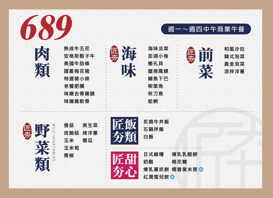 $689價位是平日限定(周一~周四中午),可以享有菜單上的所有品項吃到飽!