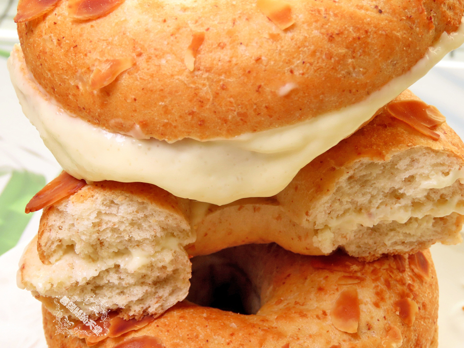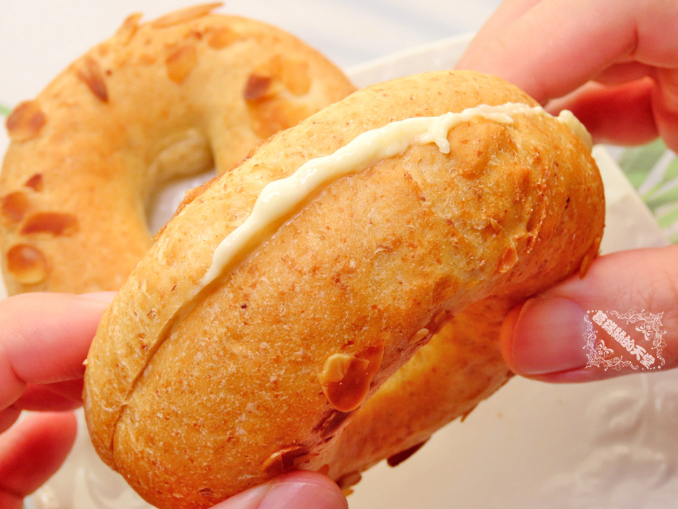 最後跟大家分享「海鹽焦糖乳酪減醣貝果」,上方有酥脆杏仁薄片,加熱以後可以看見海鹽焦糖乳酪醬的絲滑感~同樣是夾餡減醣貝果,但這款本身就有切半加入抹醬,可以更加方便且自由包夾進各人喜歡的食材去做搭配。