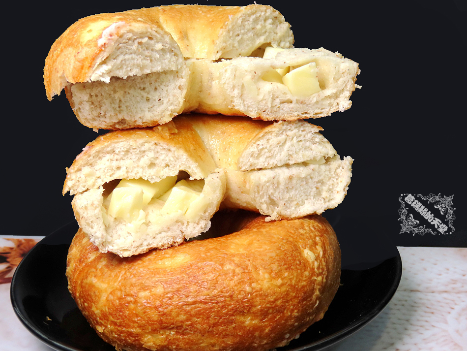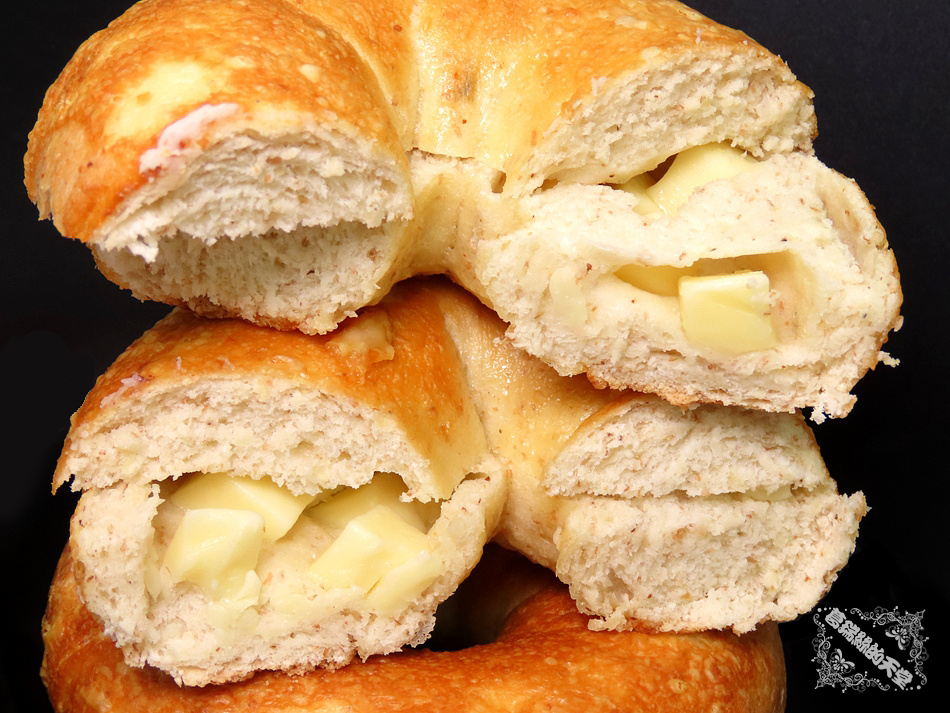 原味時代「重乳酪起司減醣貝果」也是直接把大塊乳酪丁包在貝果裡的,貝果本身沒有切分,我一樣是切半給大家看剖面~