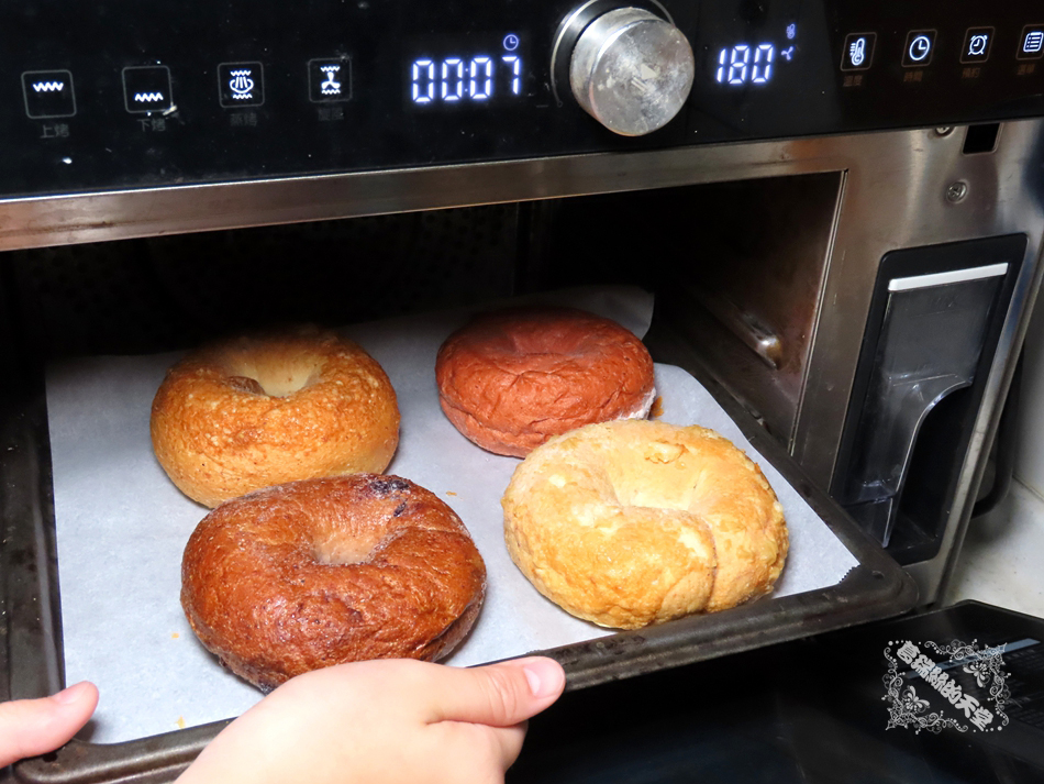 我家使用的是氣炸烤箱,可以氣炸、可以烘烤,我選擇用氣炸模式,烤箱預熱180度後,貝果無須解凍,表面噴點水,放入氣炸烤箱氣炸大約6-8分鐘即可(各家烤箱功率不同,可以依照自己喜歡的方式再微調)。