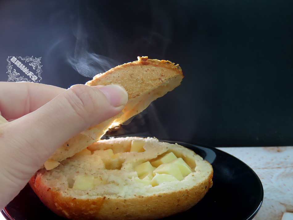 我好奇先把減醣貝果切半後再拿去氣炸,加熱出爐後打開看,發現貝果裡面熱氣氤氳,但乳酪丁的形狀和口感都依舊保留著,熱騰騰的出爐真的會令人很想趁熱品嚐美味。