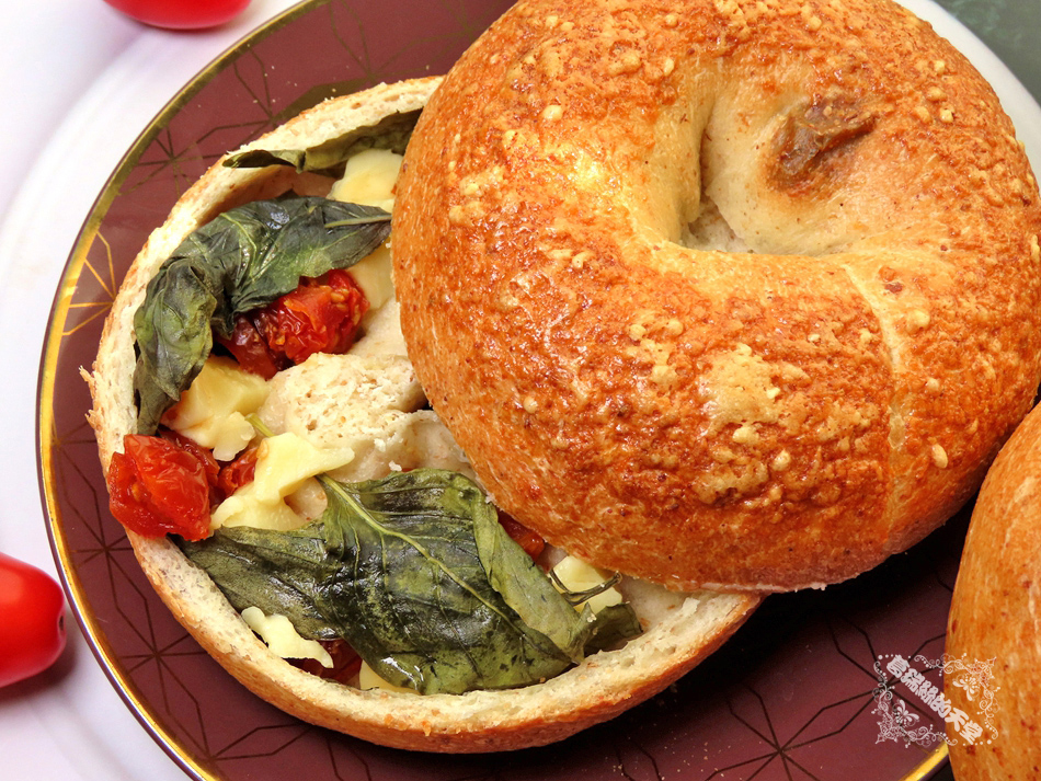 小農番茄瑪格麗特減醣貝果裡面有九層塔與乳酪丁交織,營造出迷人義式香氣,還有嚴選低溫烘焙的聖女小番茄,整體滋味鹹甜平衡,不論是當點心或當正餐都很可以,果真令人一吃就愛。