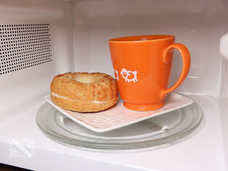 微波後的減醣貝果吃起來口感比較蓬鬆、軟Q,很像現烤出爐的一樣,重點是時間最為快速,如果平常趕著要上班、上學的話,還可以因此賴床多睡 10分鐘XD